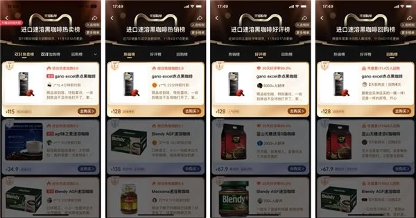 During the live broadcast, Hu Bing showed his fans the details page of Tmall Mobile, and the picture showed that the red dot glossy ganoderma coffee won the first place in the hot sales list of imported instant black coffee.