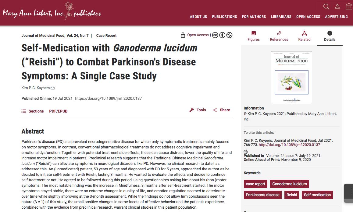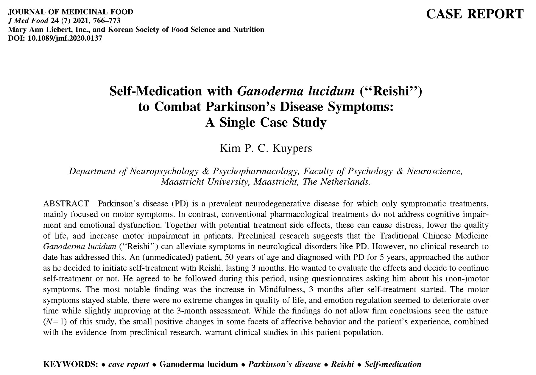 荷兰:发病五年的巴金森氏症个案服用灵芝三个月——脑袋比较不卡,也更能觉察/产生正念(Mindfullness)