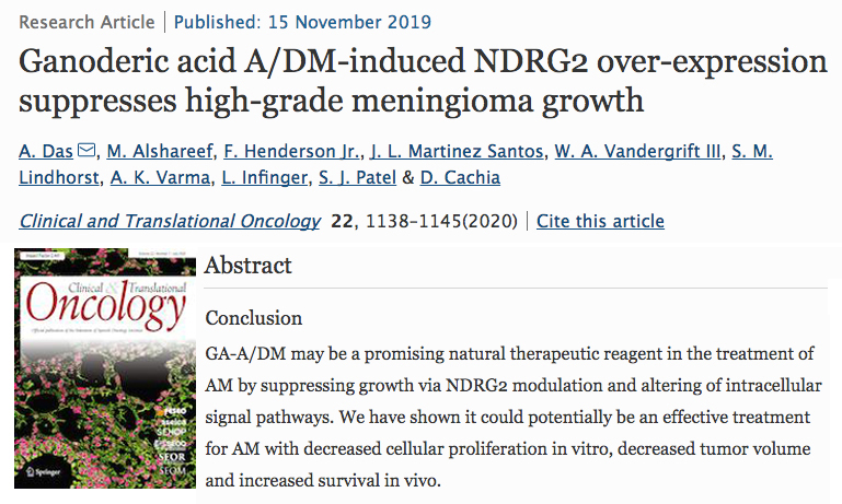 美国:灵芝酸A和DM调节抑癌基因NDRG2,抑制恶性脑膜瘤生长,延长肿瘤小鼠生存期