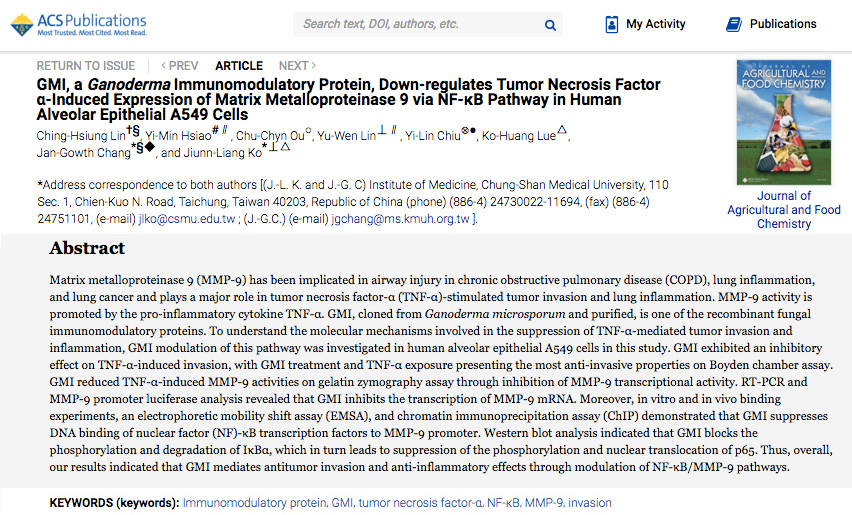 2010研究新知|小孢子灵芝免疫调节蛋白质GMI可在发炎环境下抑制肺腺癌细胞的侵袭力,降低癌转移的发生