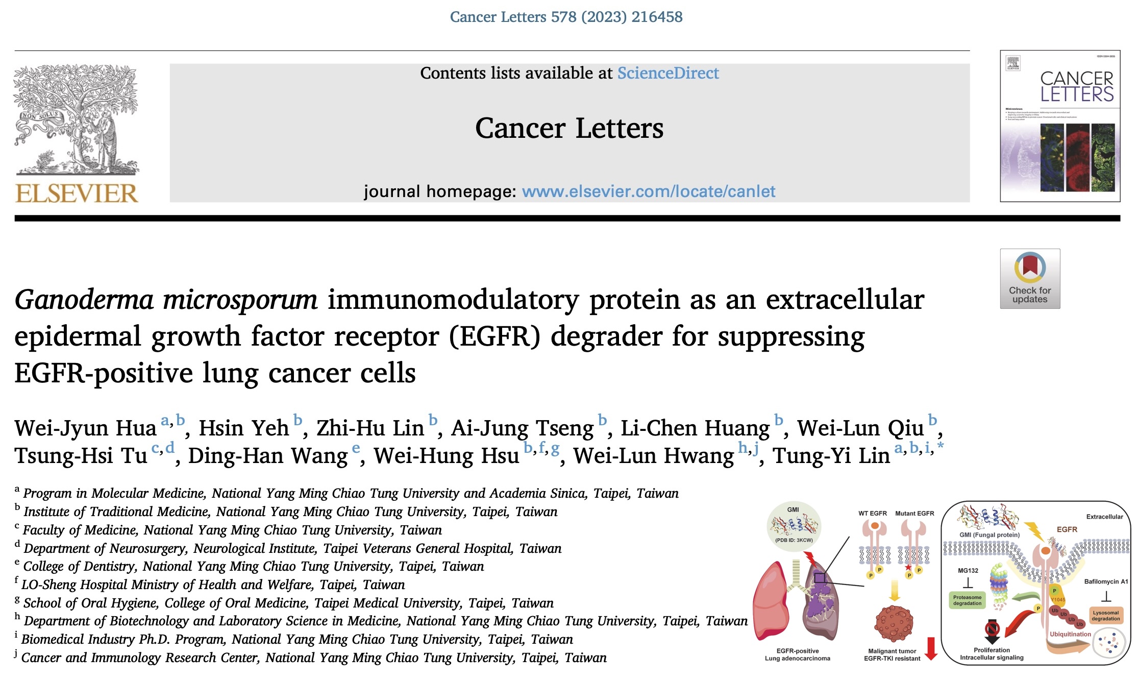 〔林东毅团队2023研究成果〕小孢子灵芝免疫调节蛋白质GMI抑制EGFR阳性肺腺癌肿瘤的重要机制——迫使癌细胞吞掉自己的EGFR