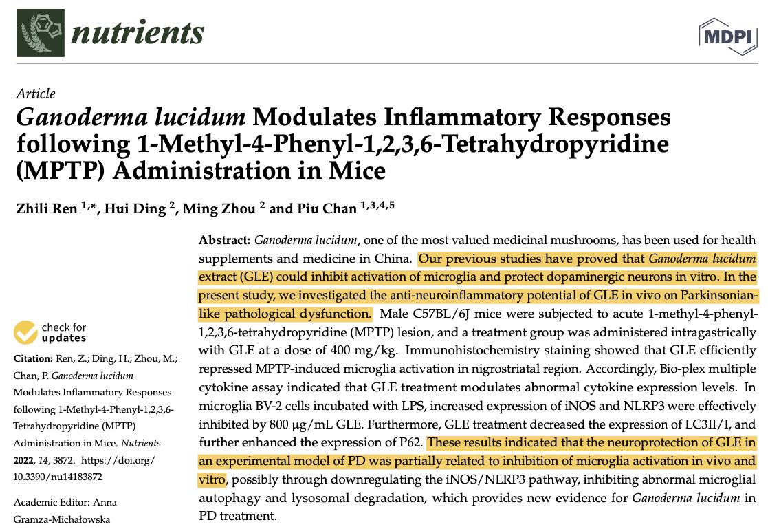 中国:灵芝子实体萃取物的抗发炎作用,有机会延缓巴金森氏症的病程