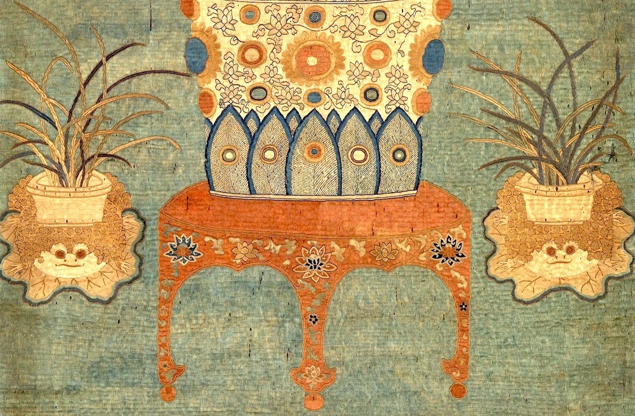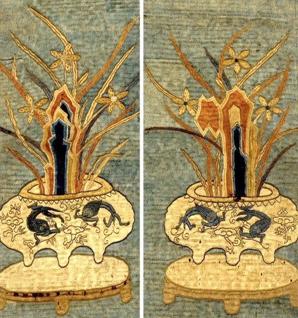 注:〈绣盆菊诗意帘〉相传是宋代作品,故其在故宫藏品的正式名称为「传宋绣盆菊诗意帘  轴」,後来经考证认为是晚明宫庭刺绣。