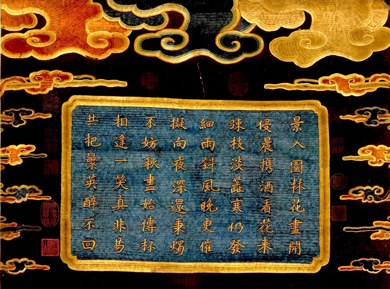 绣品最上方,是由金色丝线织绣而成的应景诗文: