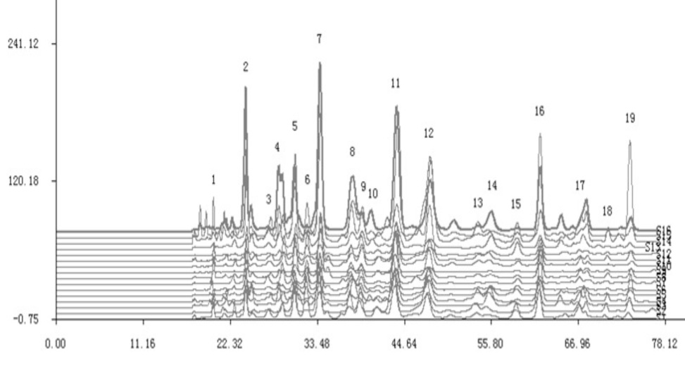 我们选取19种三萜化合物的标准品,除了上述提到的9种灵芝酸,还有灵芝酸I丶灵芝酸LM1丶灵芝酸C丶灵芝酸D丶灵芝酸E丶赤芝孢子酸A丶赤芝酮A丶赤芝酸C丶化合物B9,以及12-乙酰基-3-羟基-7, 11, 15, 23-四羟基-羊毛甾-8-烯-26-(12-Acetoxy-3-hydroxy-7, 11, 15, 23-tetraoxo-lanost-8-en-26-oic acid),建立灵芝的HPLC指纹图谱,图谱上出现的19个峰,就犹如灵芝的指纹特徵。