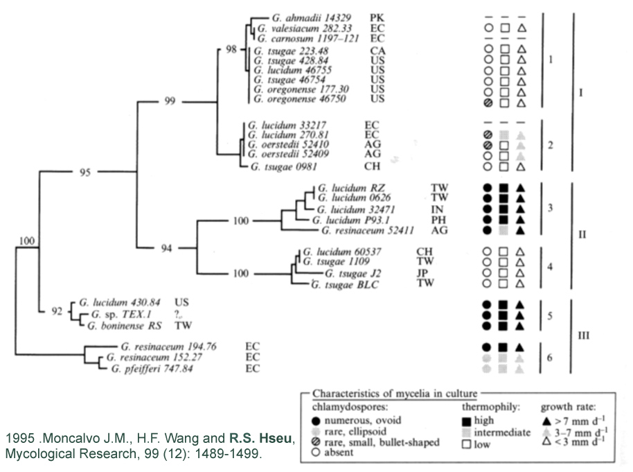 1995 年我们把世界各地收集到的红色灵芝,以基因监定的方式(比对核糖体的基因序列)进行分类,结果发现可以分出很多群,这表示不同国家地区所指称的G. lucidum实际并非同一物,而是包含好几个不同的物种(图二)(2)。