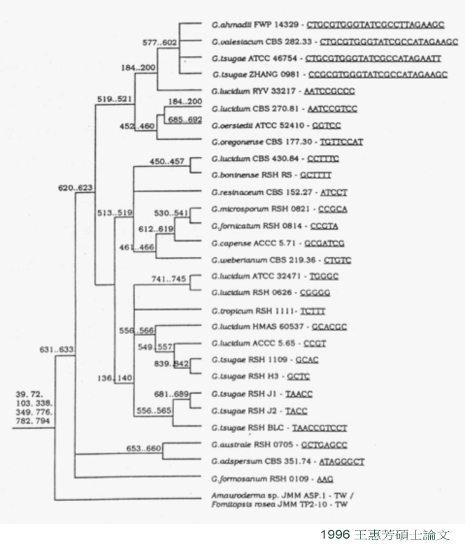 於是我花了六年的时间(1984~1990年)建立「灵芝分类监定系统」当作我的博士论文(1),经比对某一特定区段的基因序列(限制酶水解基因片段多型性图谱),确定台湾农民常种的红色灵芝其实包含两个种:G. lucidum 和 G. tsugae(松杉灵芝),而这个物种是无法交配的,所以确定是两个完全不同的物种(图一)。