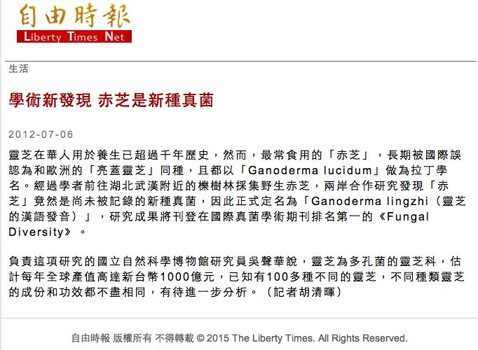 〔图四〕有学者认为,两岸常用的「赤芝」是新的灵芝菌种。(资料来源/截取自《自由时报》网站 2012 年 7 月 6 日〈生活版〉新闻;点选图片可放大)
