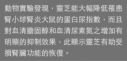 结果显示,服用灵芝 500 mg萃取质组与对照组比较,尿中蛋白质的排泄量显着减少,在第15天时约为对照组的一半,在第30天时约为对照组的1/4。再过30天,采取血液测定其血清胆固醇和血清尿素氮(BUN),发现对照组的胆固醇和血清尿素氮分别为 201±18.4 和 23.4±4.0 mg/dl,显示有增加的趋势;给予灵芝组,其胆固醇和尿素氮分别为 113.1±11 和 18.2±2.2 mg/dl。此实验结果显示,灵芝萃取质对胆固醇之增加有显着的抑制作用,对於尿素氮亦有抑制之趋势。(1)