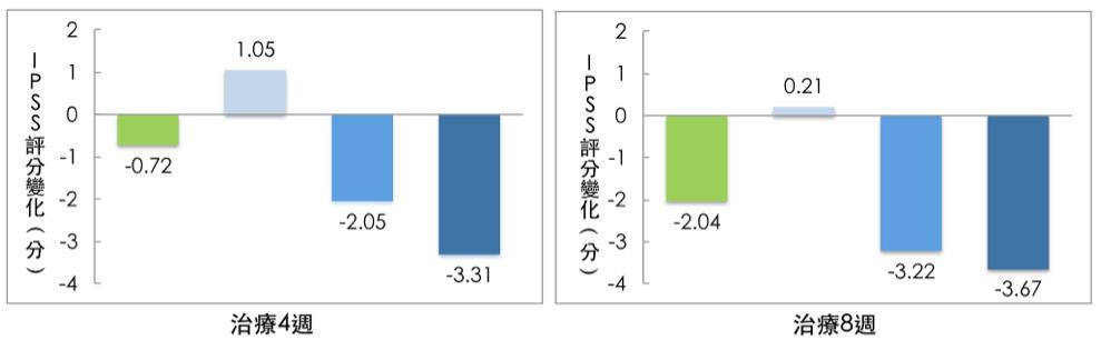 结果:治疗组IPSS评份减少2.1分(95%信赖区间:-2.96~-1.24),安慰剂组IPSS评分仅减少0.77分(95%信赖区间:-1.65~0.12),两组间有显着差异(p<0.0001)。其它观察指标,如生活品质、最大尿流率、平均尿流量、残留尿量、摄护腺体积、PSA值和睾固酮含量等,均无明显变化。