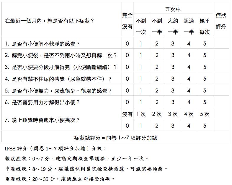 国际摄护腺症状分级(International Prostate Symptom Score, IPSS)是目前国际公认、判断良性摄护腺增生患者症状严重程度的最佳方法,它是良性摄护腺增生患者下尿路症状严重程度(即排尿困难程度)的主观反映,且与最大尿流率、残留尿量及摄护腺体积无明显相关性。评分表上共有七项问题,每项问题都有五个答案,各别以0~5分来表示患者症状的严重性,患者可依本身状况作答,最後将七项评分加总,即可知道摄护腺的健康情形。